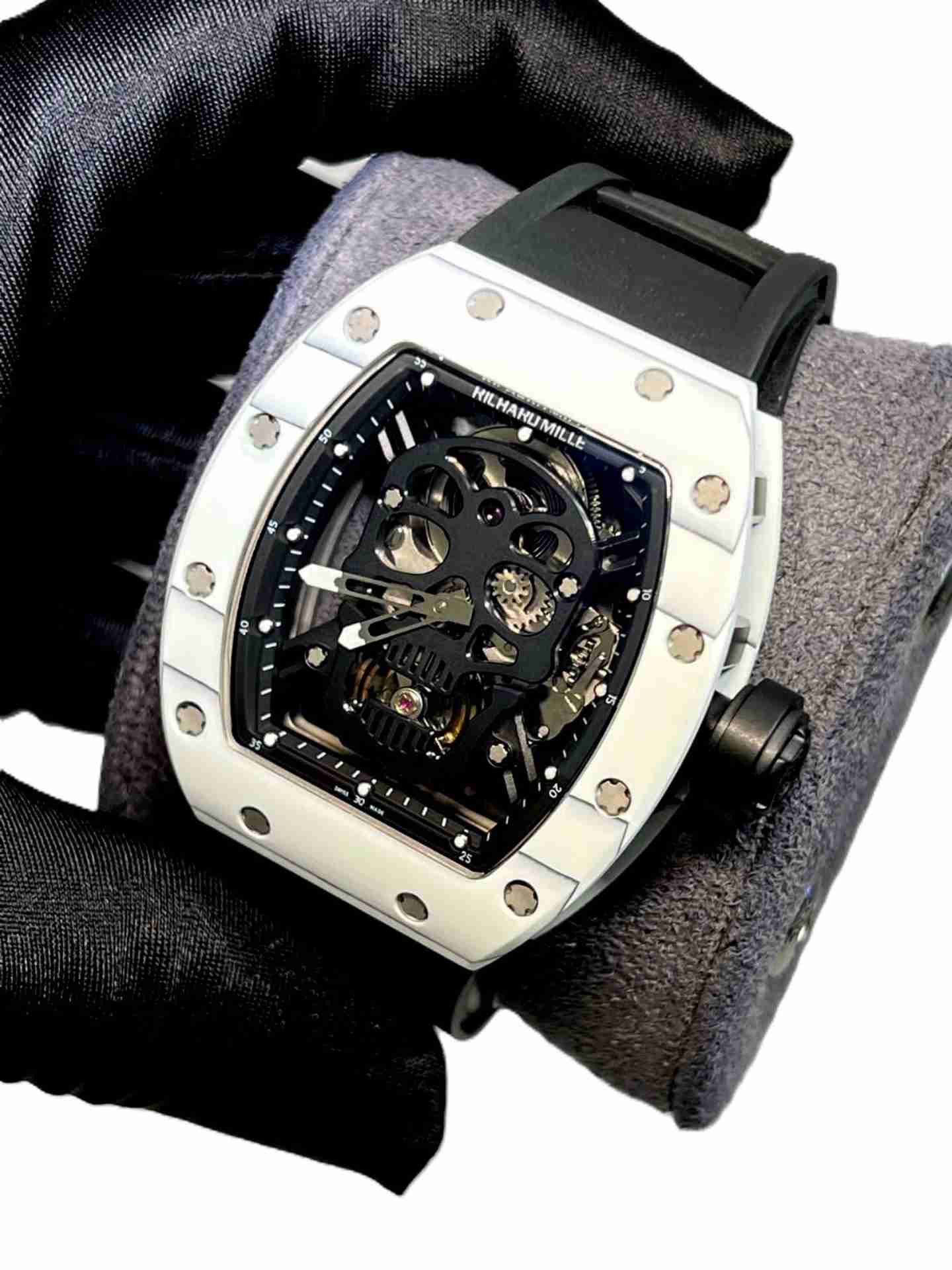 Richard Mille white watch with black skeleton with black rubber strap super clone watches in Dubai at watchesindubai.com